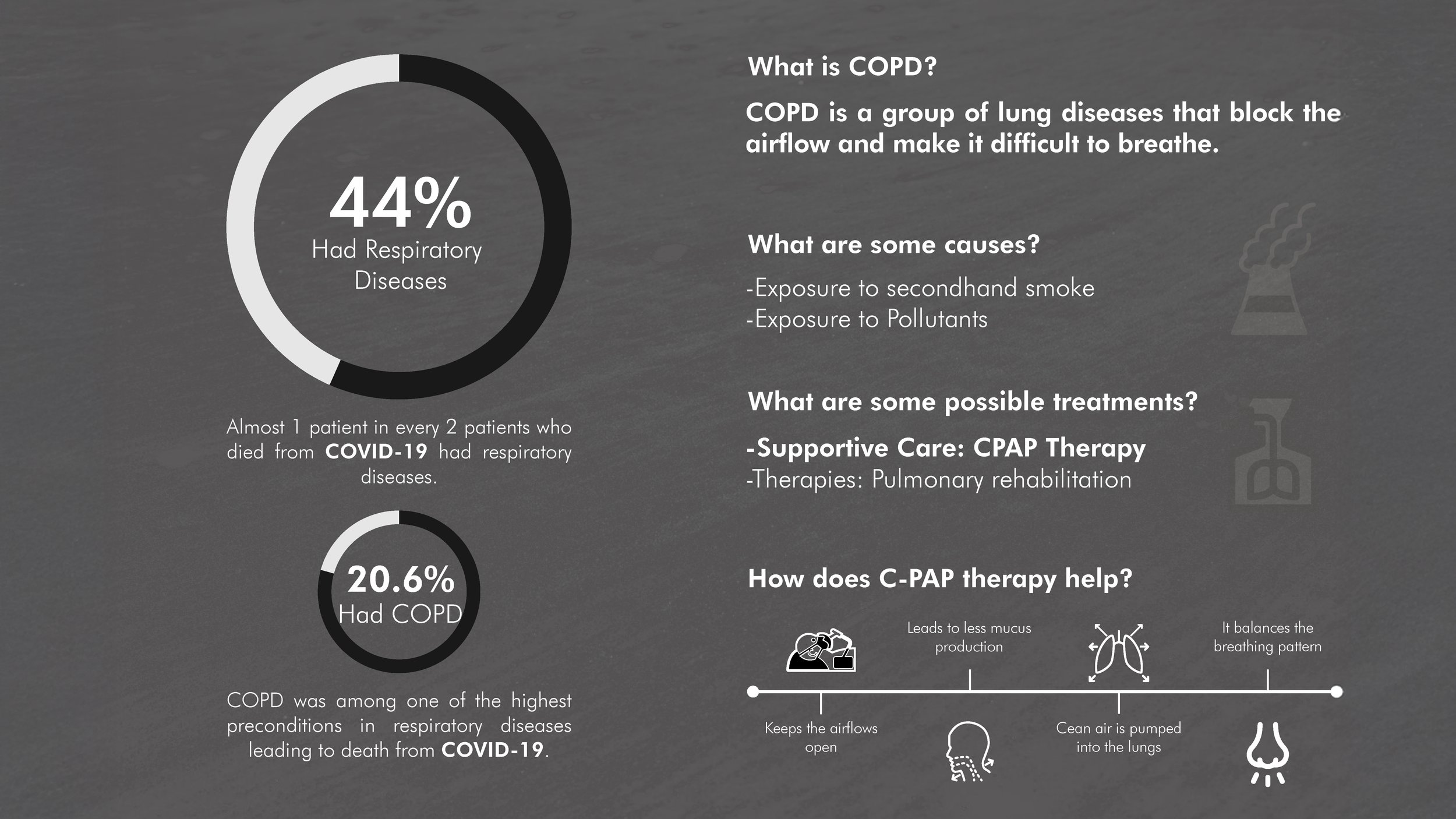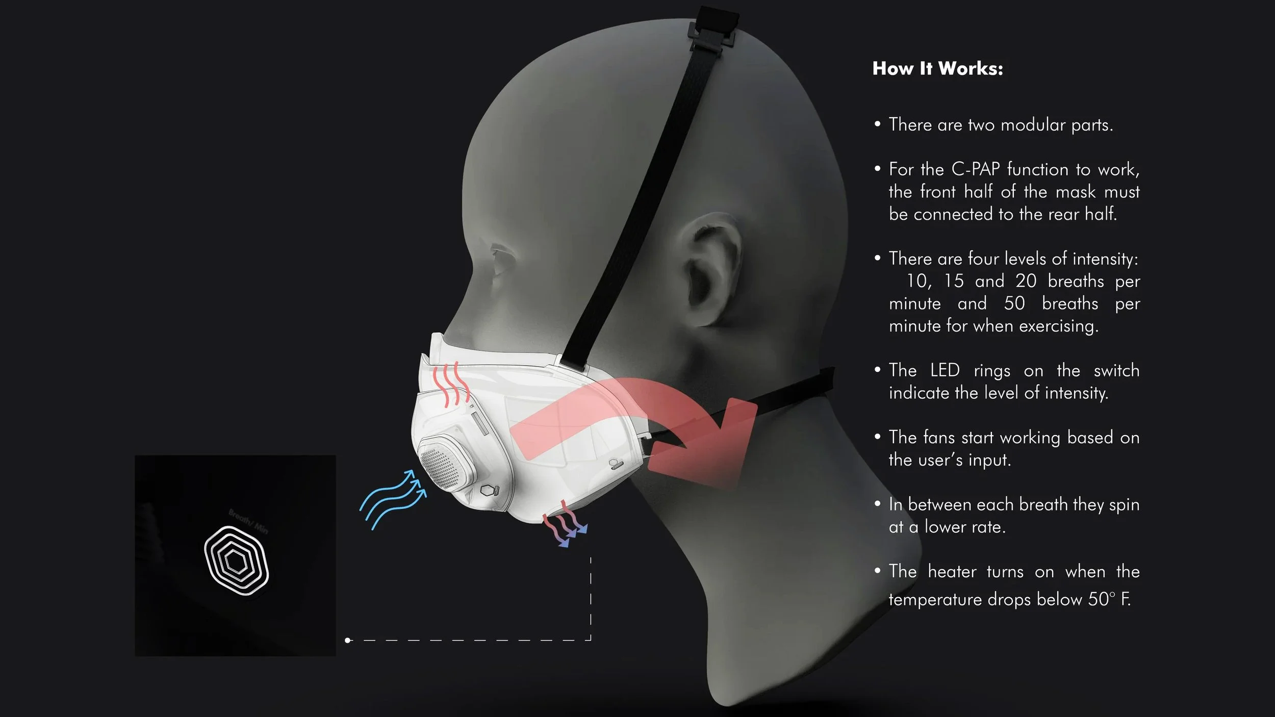 This research-intensive project began with broad research and ideation, resulting in a 3D-printed prototype that addresses the heightened risk for COVID-19 in COPD patients. The solution is a compact, comfortable mask that adapts CPAP therapy to effectively help this vulnerable group.